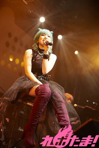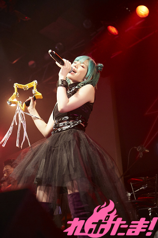 今回は彼女にとって、初のバンド編成でのソロライブということで、アコースティックコーナーも気合い十分! 「ぜひ生演奏でやりたかった」という「またあした」、そしてこの日ギターで参加している馬渕直純「先生」(ニックネーム)が手掛けた「ギミー・ラブ」を星型のタンバリンを手に歌い上げた。