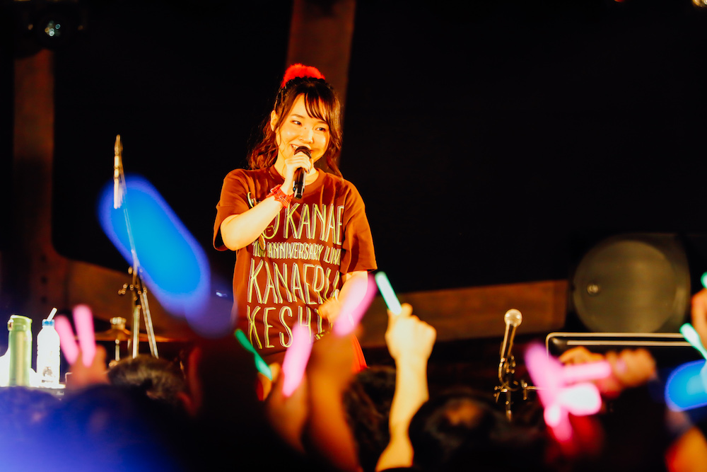 「かな恵ちゃん!」コールに迎えられて再登場した伊藤が身につけていたライブTシャツは、誕生日に放送されたネット配信の特別番組で、ファンにデザインを決めてもらったメモリアルな一品だ。その後一通りライブグッズの紹介を終えると、この日のステージを盛り上げてくれたバンドメンバー紹介へ。