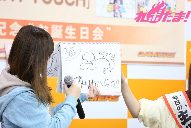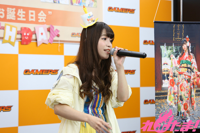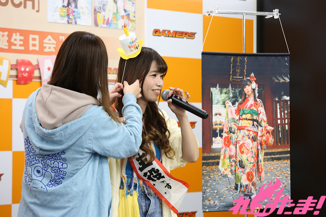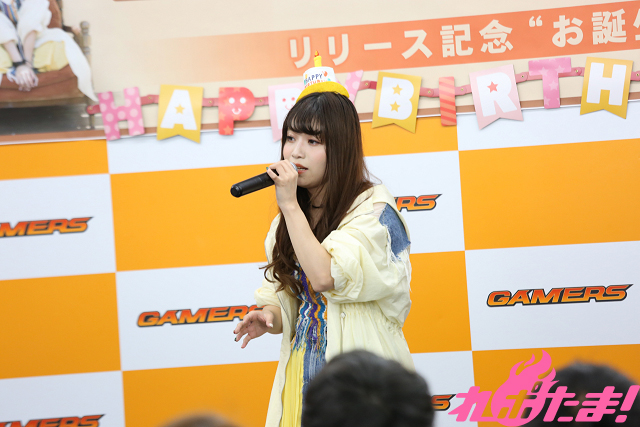 今回は10月に彼女のお誕生会を兼ねて開催される予定だったイベントの振り替え開催ということで、「本日の主役」たすきをかけ、頭に、HAPPY BIRTHDAYと書かれているゴキゲンな帽子を被った亜咲花さん。二十歳になった感想を「お酒を飲めるようになった!」と語った彼女。先日行われた忘年会では、梅酒をロックで20杯も飲んだそうで、「今度ぜひお酒を飲みながらできるイベントをやりたいです!」と意気込んだが、司会のMAGES.の小林さんから「お酒のイベントで一度でも失敗したら二度とやらないですよ」と釘を刺されていた(笑)。