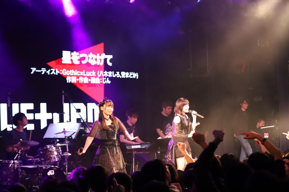 そしてライブ中盤には豪華なサプライズゲストも登場した。昼の部では、DIALOGUE+メンバーも出演する次世代声優育成ゲーム『CUE!(キュー)』より、遠見鳴役の土屋李央と、夜峰美晴役の安齋由香里がステージに姿を現すと、思わぬ豪華ゲストに会場が沸き立つ。自らこのイベントへの出演を直訴したという土屋は高音キーが特徴的な「Relive」を歌いこなし、また安齋は自身が主役として出演した作品「RELEASE THE SPYCE」の主題歌「スパッと︕スパイ&スパイス」で、流石のパフォーマンスを見せつけた。一方夜の部では、八木ましろ・菅まどかの声優デュオユニットGothic×Luckが登場した。ピアノ弾き語りアレンジから始まったイントロに乗せて歌声を披露する宮原・飯塚に呼び込まれた2人は、「星をつなげて」を披露。最後には再度宮原・飯塚も加わり4人の歌声が響き渡る貴重なステージとなった。