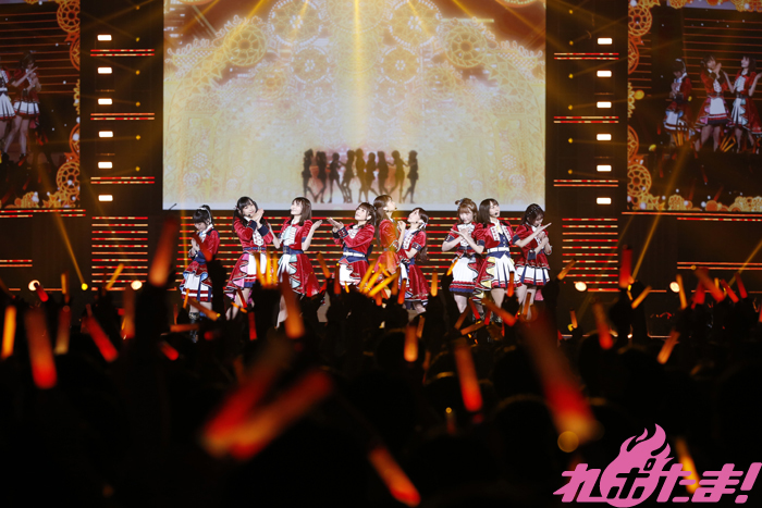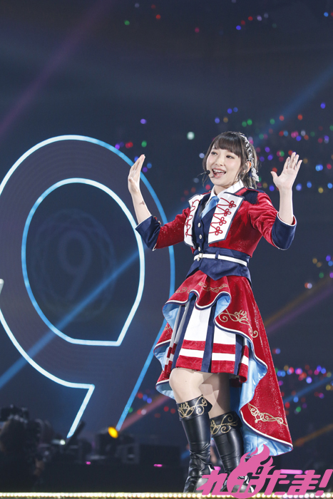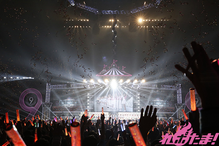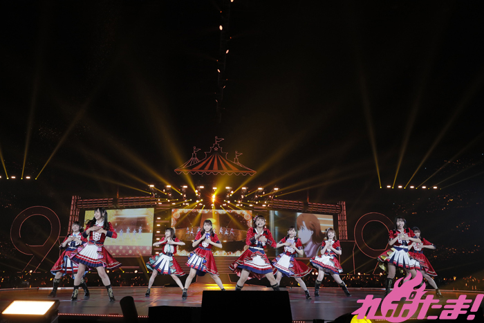 続いて「9年分の『ありがとう』と『おめでとう』を込めて全力でパフォーマンスします」と意気込みを語ると、この日のためにセレクトしたというラブライブ!テレビアニメメドレーがスタート。「僕らは今の中で」、「No brand girls」、「START:DASH!!」、「それは僕たちの奇跡」、「ユメノトビラ」、「KiRa-KiRa Sensation!」と息もつかせぬ名曲の連続、変わらぬ歌声とパフォーマンスに客席では熱い声援を送る人、涙を浮かべる人と様々な感情を胸に9人を見つめていた。