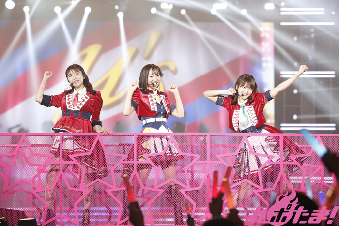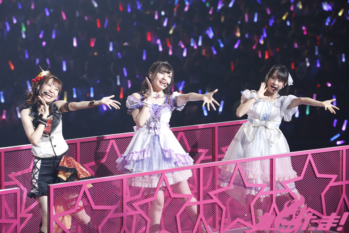 フレッシュなパフォーマンスで客席を魅了した後は「ラブライブ!サンシャイン‼」より派生したユニット4組が登場。トップバッターを飾った伊波さん、斉藤さん、降幡さんから成るCYaRonは海賊風衣装に身を包みフラッグを振りながら「近未来ハッピーエンド」を爽やかに歌唱すると、続く「夜空は何でも知ってるの?」では打って変わってしっとりとした歌声に会場のファンは聞き入っていた。