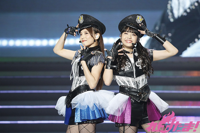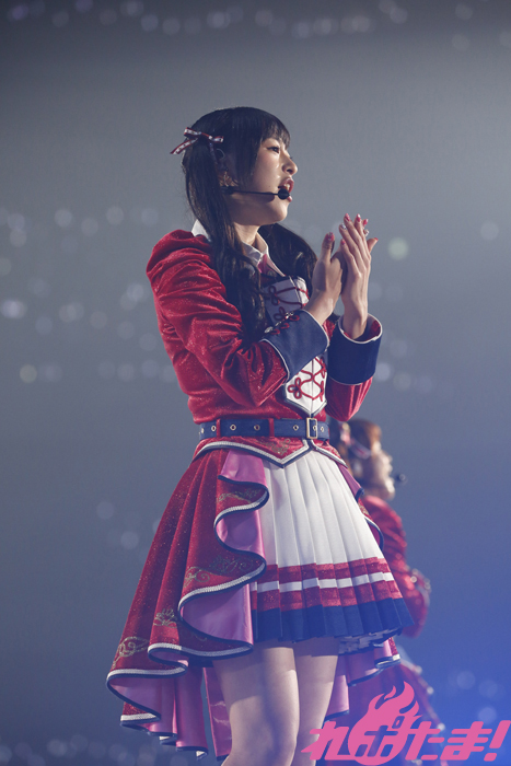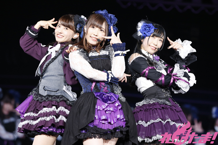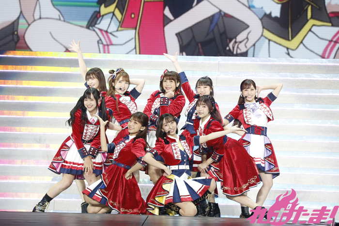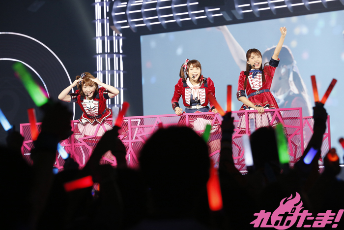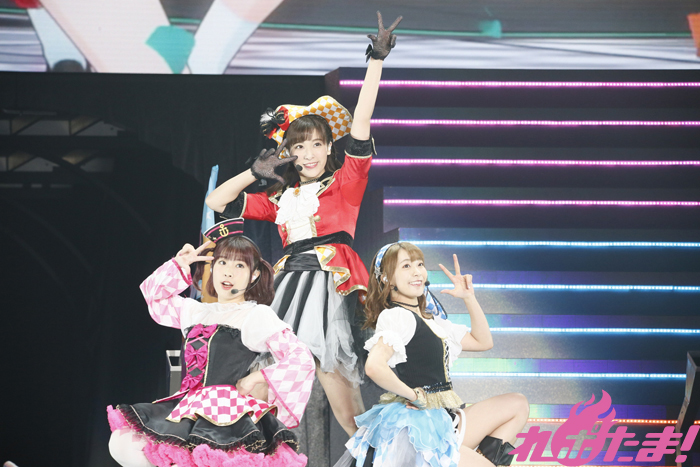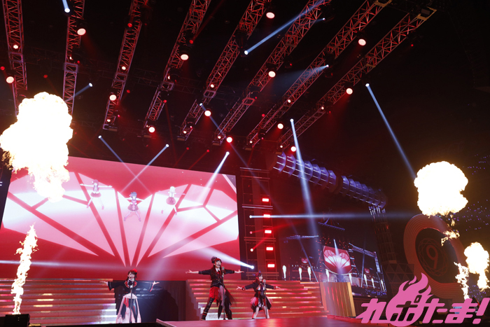 会場が赤く染まる中、ゴシックな衣装を着たGuilty Kissの逢田さん、小林さん、鈴木さんが登場すると「Guilty Eyes Fever」、「Guilty Night,Guilty Kiss!」を披露、キレのあるダンスとセクシーな歌声により作り出されたGuilty Kissの世界に観客を引き込んでいた。