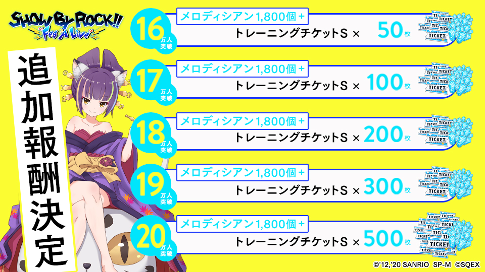 「SHOW BY ROCK!! Fes A Live」の事前登録者数が 15 万人を突破いたしました。こちらを記念して、追加報酬が決定! なんと事前登録者数 20 万人突破で、ゲーム内アイテム「トレーニングチケット S」を最大 500 枚プレゼント! !