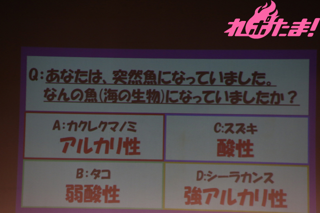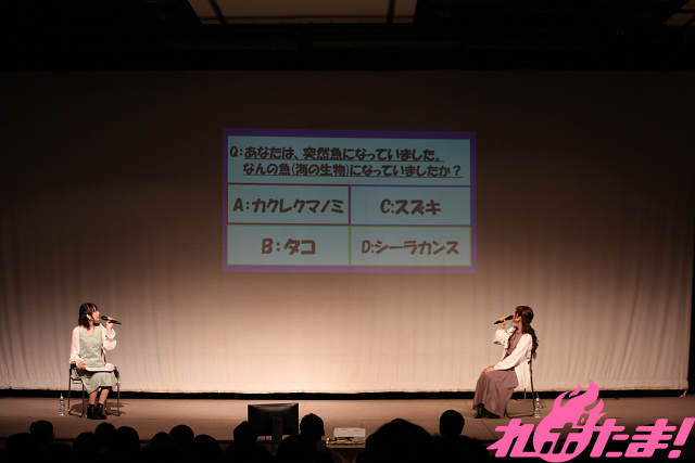 昨年の誕生祭でも行なわれた「れいれい心理テスト」は、近藤さん自身が考えた心理テストに、ファンと南さんがチャレンジ! この日のテスト内容は「あなたは、突然魚になってしまいました。なんの魚になってしまいましたか?」。