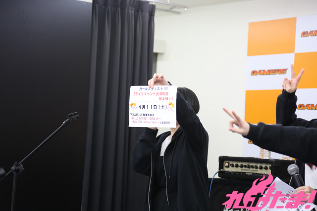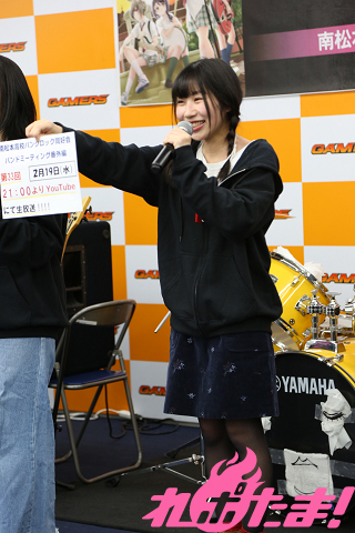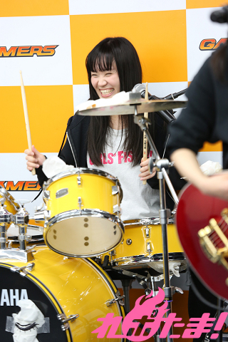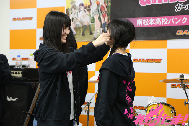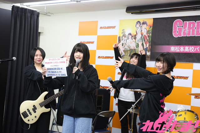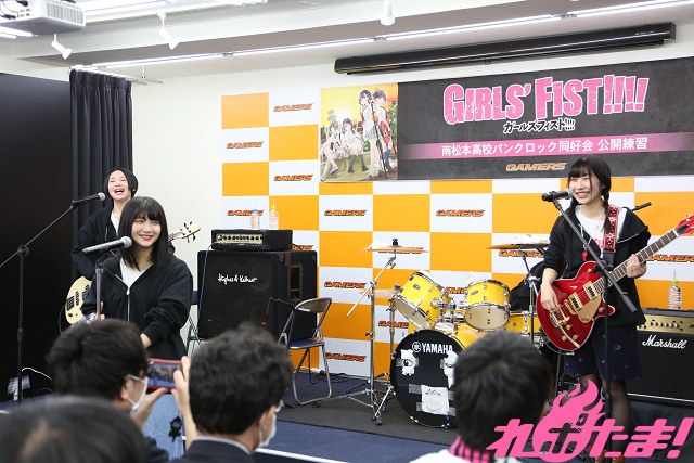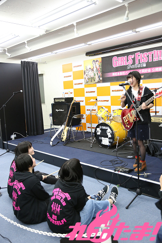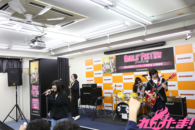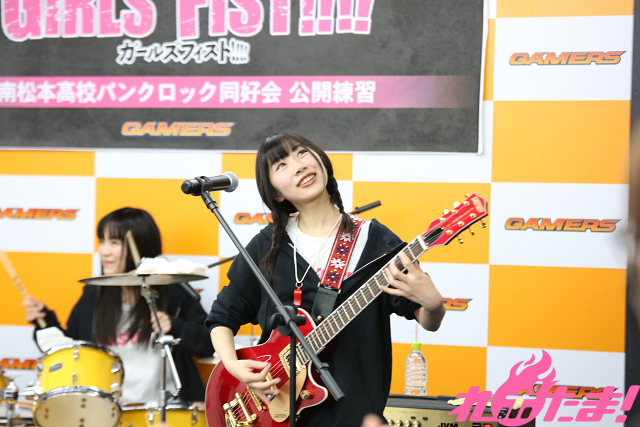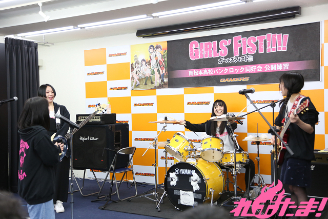 1月15日に企画盤CD第3弾「Only my Way!!!!」をリリースし、ますます絶好調! バンド漫画『ガールズフィスト!!!!』発の南松本高校パンクロック同好会(浅見春那(Vo・奈川芳野役)、内山つかさ(Dr・白瀬双葉役)、奥村真由(G・坂ノ下奏恵役)、古川由利奈(B・藤森月役)が、恒例の公開練習を東京・AKIHABARAゲーマーズ本店で行なった。