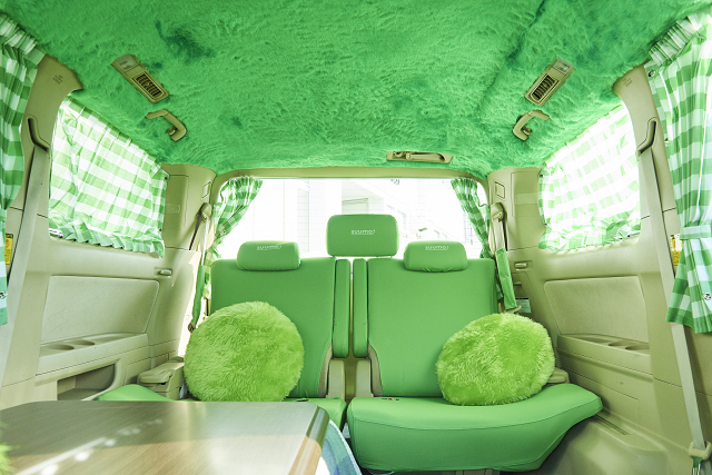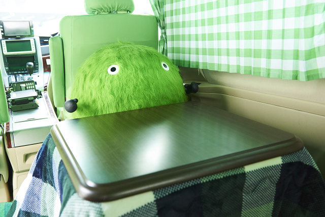 緑のシートが広々としていてリラックスできました。こたつを挟んでスーモくんがこちらを向いていたので、乗っているときはずっと見つめ合いながらドライブ(笑)。天井の緑のモフモフを“ああ、これがスーモくんの毛並みなんだ”とずっと触っていました。