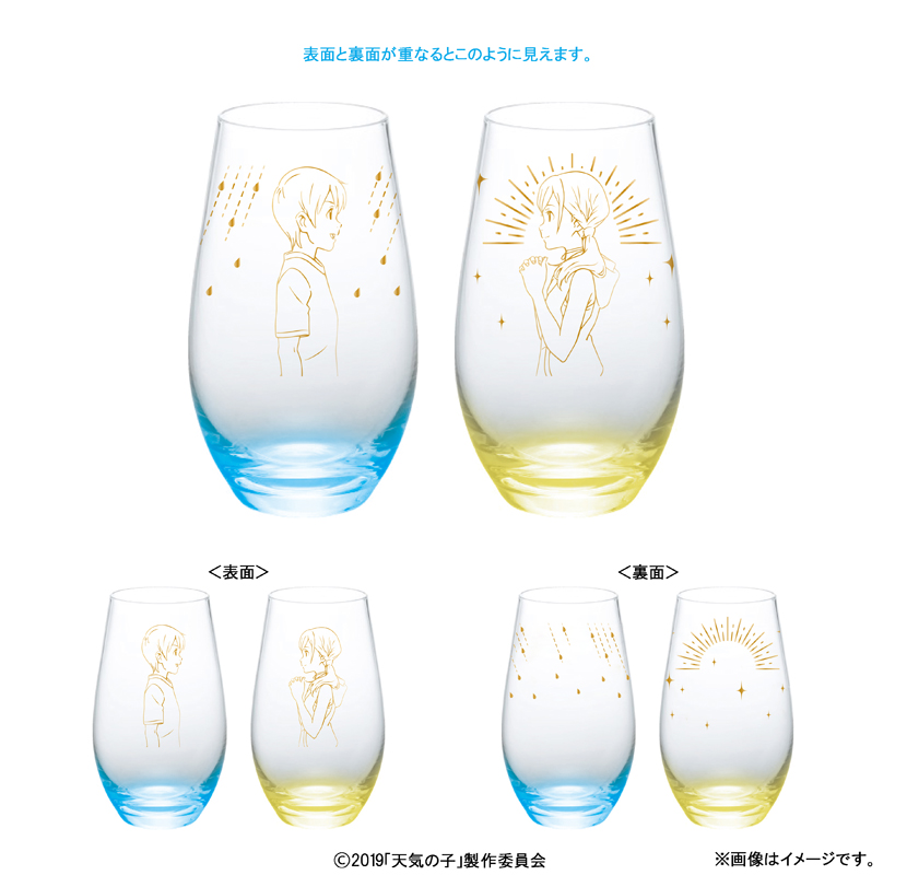「ペアグラス」には作画監督・田村篤氏描き下ろしの帆高・陽菜を高級感のある金色でそれぞれプリント。表面・裏面を重ね合わせることにより“雨”“晴れ”デザインが完成されます。