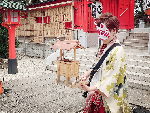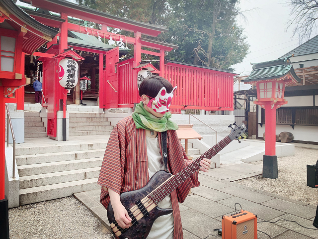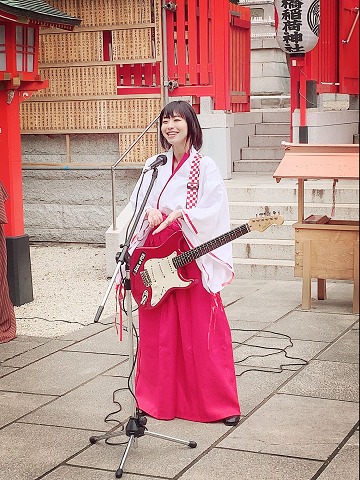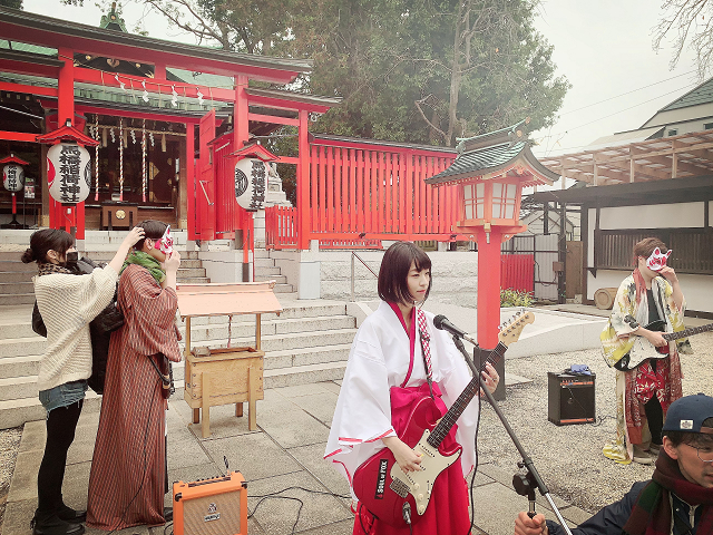 続いては、Soul of Foxのメンバーたちによる境内の参道を演奏しながらの練り歩き。3人は宴を楽しむよう楽器を奏で笑顔で練り歩く。中でも、ふたたび巫女姿になって練り歩く福山沙織の楽しげな姿と表情には、ぜひ注目していただきたい。