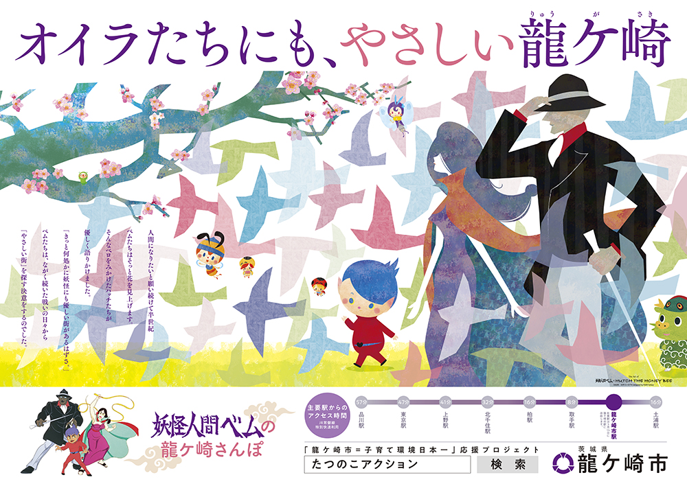 JR常磐線の新駅名「龍ケ崎市駅」誕生にあわせ、名作アニメ『妖怪人間ベム』&『昆虫物語みなしごハッチ』の 50周年記念企画『The Art of 妖怪人間ベム×HUTCH THE HONEY BEE』とコラボレーション。 絵本作家・はりたつお氏が描く、ベムたちやハッチが市の人気スポットをお散歩する風景をオリジナルイラスト6作品で表現。 市内やJR常磐線沿線にて披露。