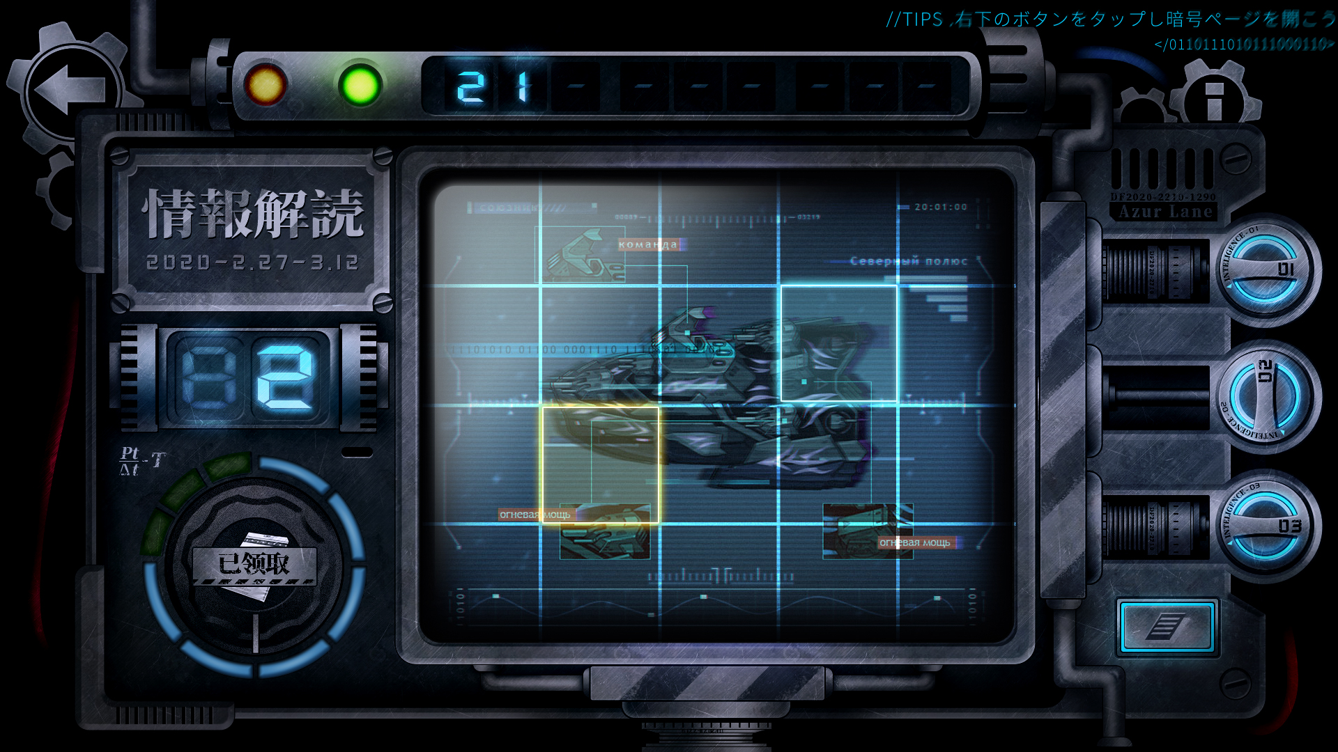 情報を解読して「暗号ページ」を解禁し、暗号の「情報画面」をタップすることで報酬を入手できるミニイベントを開催中です。情報を解読するには、イベント「凍絶の北海」で「pt情報子」を入手する必要がありますので、本イベントとあわせてお楽しみください。詳細はゲーム内のヘルプ画面をご確認ください。