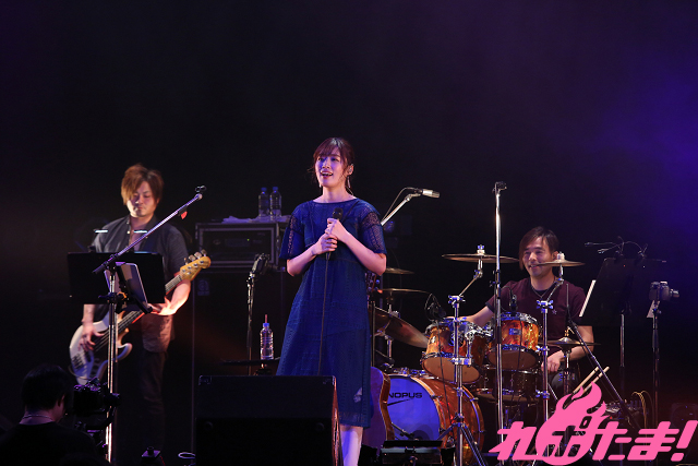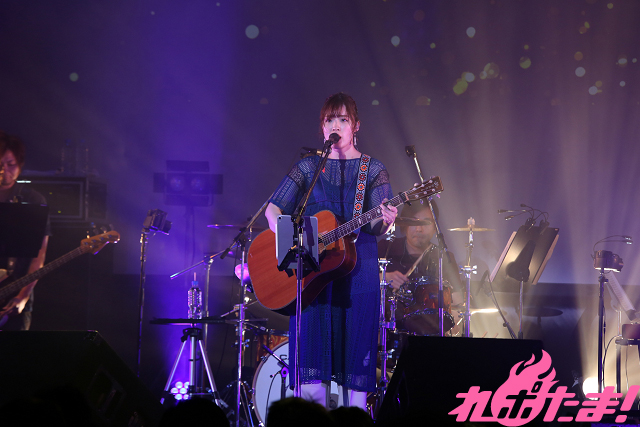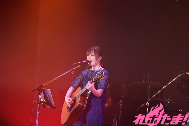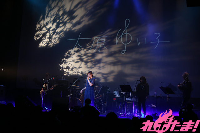 迎えたライブ本編はフルバンド編成で開催。ステージにメンバーが現れると、自然と拍手が沸き起こり、まずはあいさつ代わりにPS4ゲーム『リトルウィッチアカデミア 時の魔法と七不思議』主題歌「時のミラージュ」を歌唱。そしてアニメ『リトルウィッチアカデミア』第2クールEDテーマ「透明な翼」を披露したあとは「踊るように聴いてください!」と「星が眠るまで踊ろうよ」を、さらに「みんなが普段抱えている“色々なもの”」を「木星バット」で打ち飛ばすと、「今日はライブの醍醐味を感じてください!」と語り、続いて披露されたのはアニメ『宝石の国』EDテーマ「煌めく浜辺」。幻想的な空間に包まれると「光の淵」、「205号室」を切なく歌い上げ、大原ゆい子の作り出す世界に引き込まれていく。