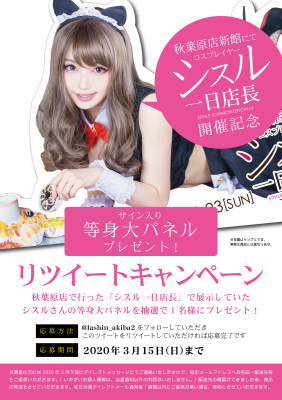 らしんばん秋葉原店新館のTwitter【https://twitter.com/lashin_akiba2】をフォロー&該当のツイート【https://twitter.com/lashin_akiba2/status/1234317026807570432】をRTしていただければ応募完了! シスルさんをご自宅にお迎えできるチャンスです!