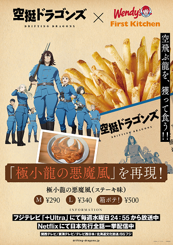作中で登場する「極小龍の悪魔風」の味を再現したフレーバーポテトが期間限定で販売決定!また、期間中タイアップ商品を含むフレーバーポテトをご注文のお客様には先着で「空挺ドラゴンズ」デザインの限定ポテト袋で商品をご提供いたします。