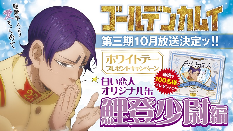 3月14日(土)のホワイトデーに合わせて、TVアニメ『ゴールデンカムイ』公式Twitter(@kamuy_anime)上にて「白い恋人オリジナル缶/鯉登少尉編」が当たるキャンペーンを開催ッ!!!