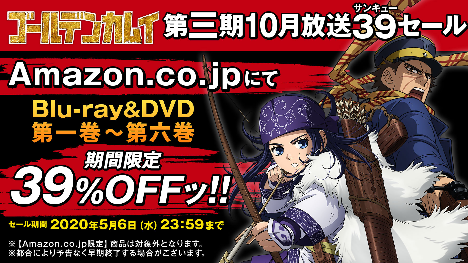 第三期の10月放送が決定したTVアニメ『ゴールデンカムイ』。これまで熱いご声援をいただいた皆様に感謝の気持ちを込めてAmazon.co.jpにてBlu-ray&DVD第一巻~第六巻を39%OFFでご提供する「TVアニメ『ゴールデンカムイ』第三期10月放送39(サンキュー)セール」を期間限定で開催いたします。
