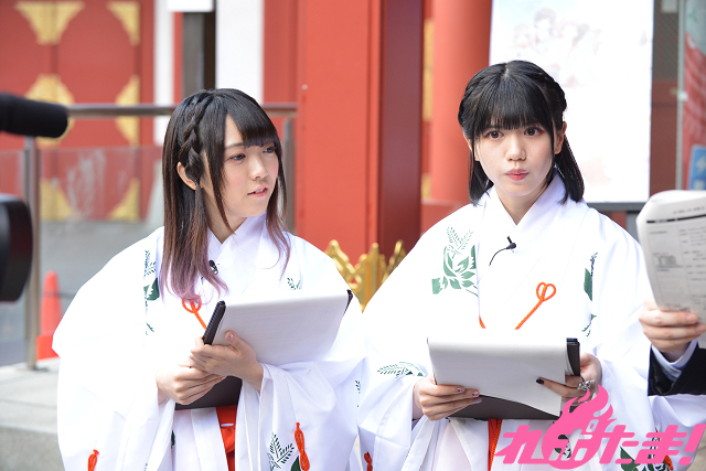 巫女装束に身を包んだ西尾さんと成海さんが登場すると、まずは資料館で開催中の『春が来た!Reバース札遊び~神田明神×ブシロードTCG展~』の紹介からスタート。1階は巨大なReバースの絵馬やスリーブの歴史年表、アニメ「りばあす」名シーン集などのパネル展示、2階はReバースのカードや台本、作中に登場する制服などが展示されており、2人は「ワクワクしちゃう」「幸せ溢れる空間」と大興奮!