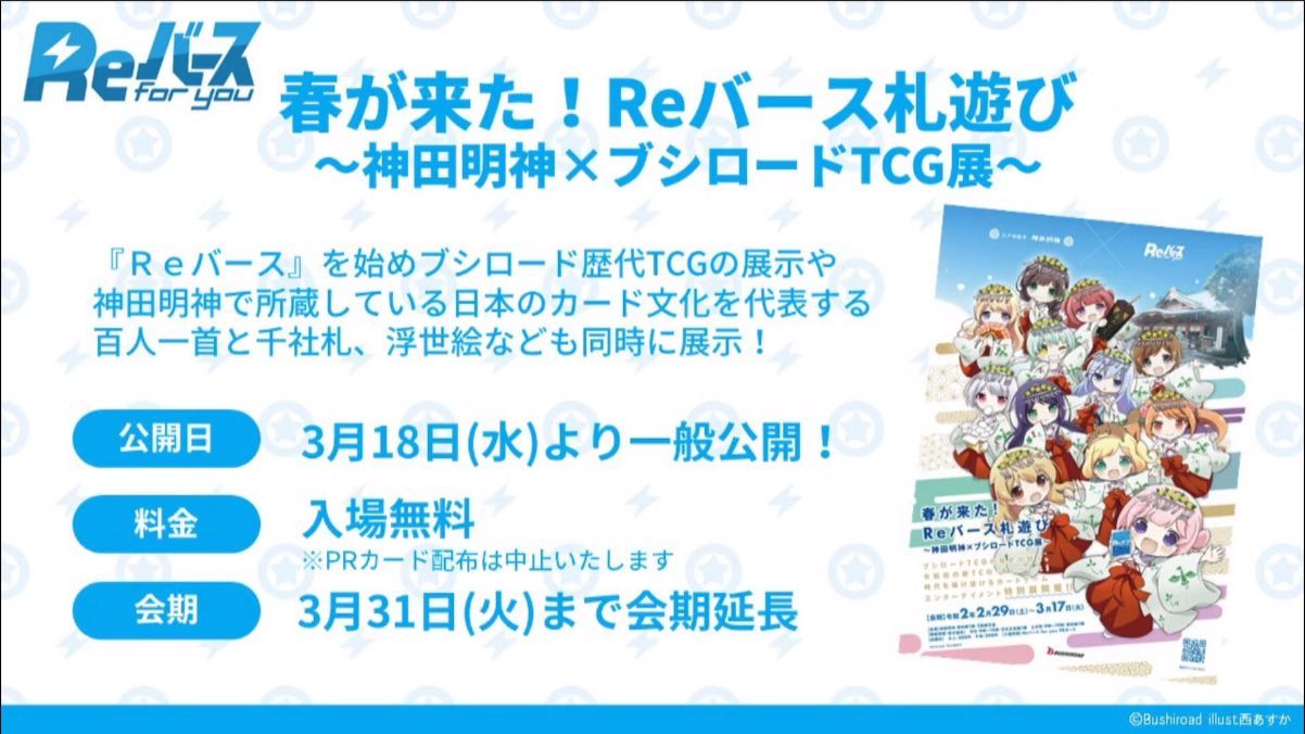 3月19日(木)発売となる「Reバース for you」トライアルスタートデッキを記念した生放送『トライアルスタートデッキ発売直前スペシャル生放送』が3月17日(火)東京・神田明神で行われ、西尾夕香さん(東山有役)、成海瑠奈さん(猫ヶ洞青役)、原作・作品プロデューサーの西あすかさん、開発責任者の浅野敬一郎さんが出演。3月18日(水)より一般公開となる『春が来た!Reバース札遊び~神田明神×ブシロードTCG展~』の様子や、Reバースの最新情報が届けられた。