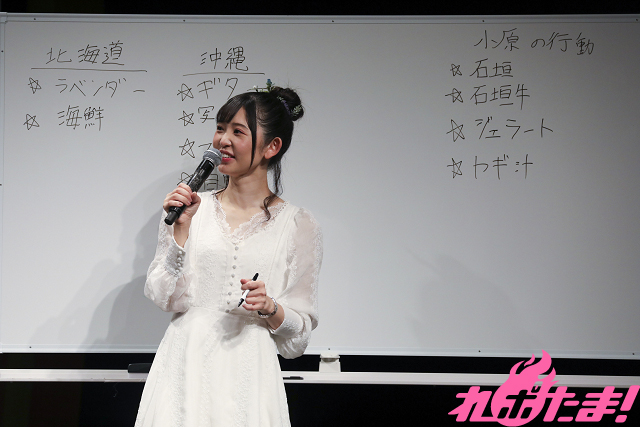 「農園トラベル会議」コーナーでは、小原さんが挙げた「ファンと一緒に行ってみたい場所」を受けてファンに投票してもらった結果をランキング形式で発表。ホワイトボードに小原さんが具体的に行きたい観光地などを書いていく。