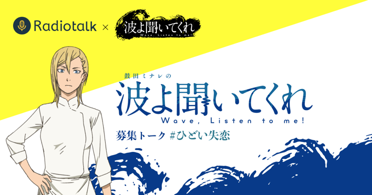 さらに、AIR-G’でレギュラー放送中のラジオ「波よ聞いてくれ ~Wave,Listen to me!~」を“配信版”として配信中の「Radiotalk」で、『波よ聞いてくれ』とのコラボキャンペーンの実施が決定!テーマ『♯ひどい失恋』でトークを募集し、なんと最優秀賞はAIR-G’でのラジオにゲストとして出演することができます。