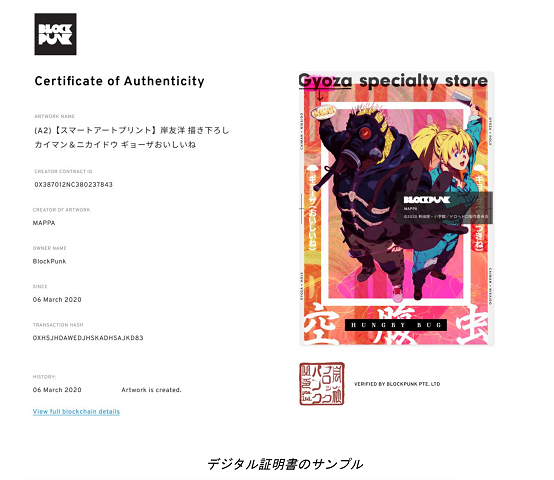 各商品に NFCチップとQRコードが搭載されており、これらをスキャンすることで、ブロックチェーン上に保存された「デジタル証明書」を確認できます。この証明書には、イラストレーターや作品の詳細、商品の所有者履歴などの情報が記録されており、商品が正規品であることを証明します。