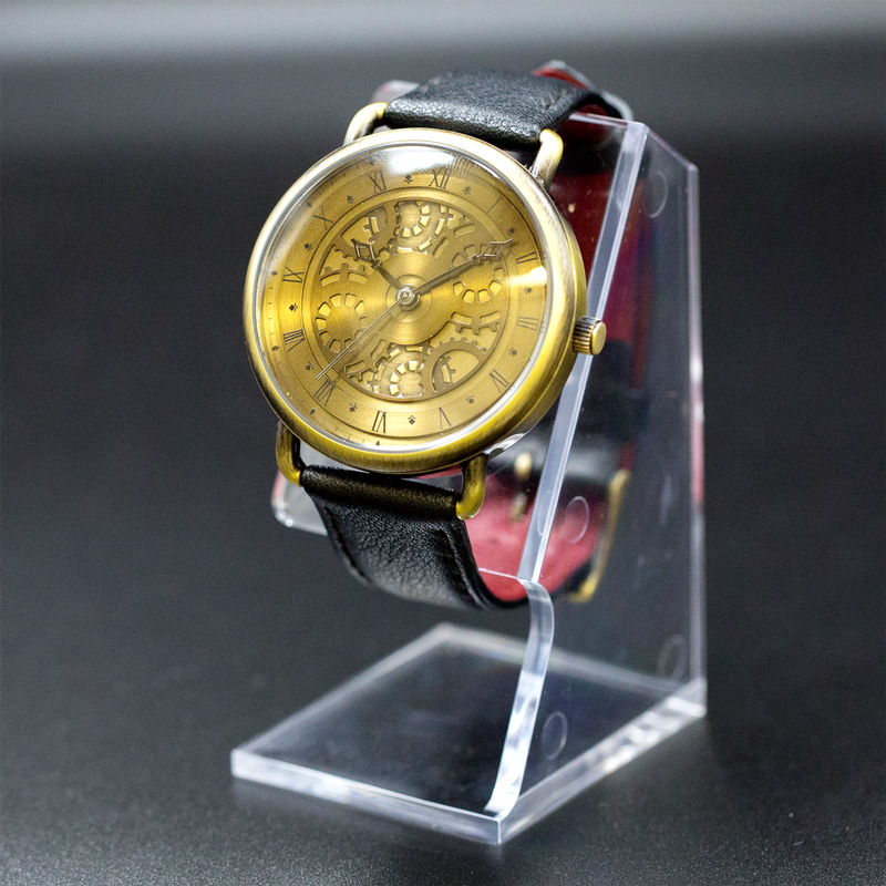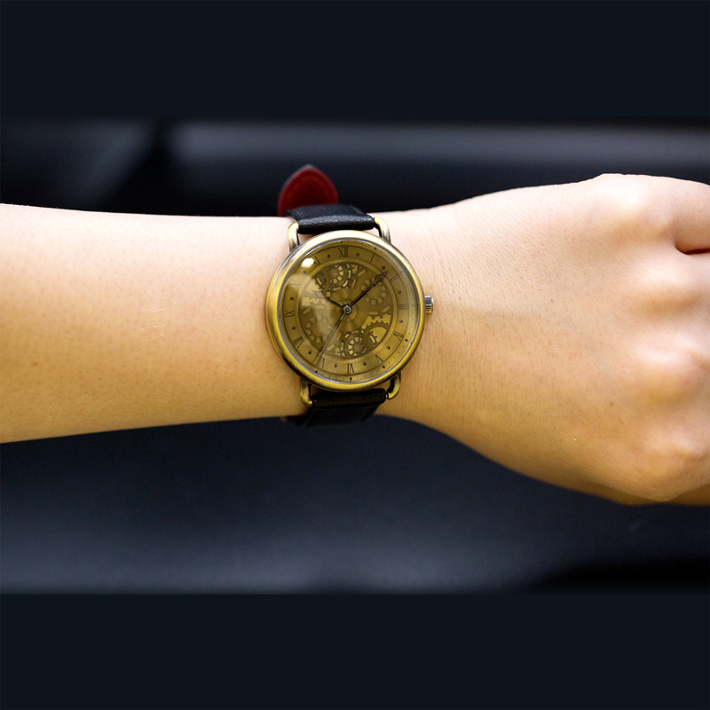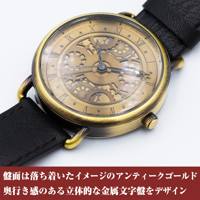 重厚感のある金属文字盤には狂三の時間を操る能力を司る天使”刻々帝<ザフキエル>”のように歯車を奥行き感のある立体的なデザインで施し、アンティークゴールドで印象的な金色の左目を表現。