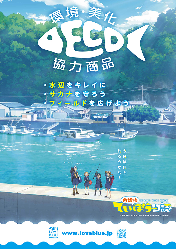 釣り環境の美化への取り組みである「LOVE BLUE~地球の未来を~」とTVアニメ「放課後ていぼう⽇誌」のコラボポスターが完成いたしました。 釣り⼈の皆さんが「環境・美化」マークの表⽰された釣り関連製品をご購⼊いただいた売り上げの⼀部を元に、⽔辺の社会貢献事業「LOVE BLUE 事業」が⾏われています。