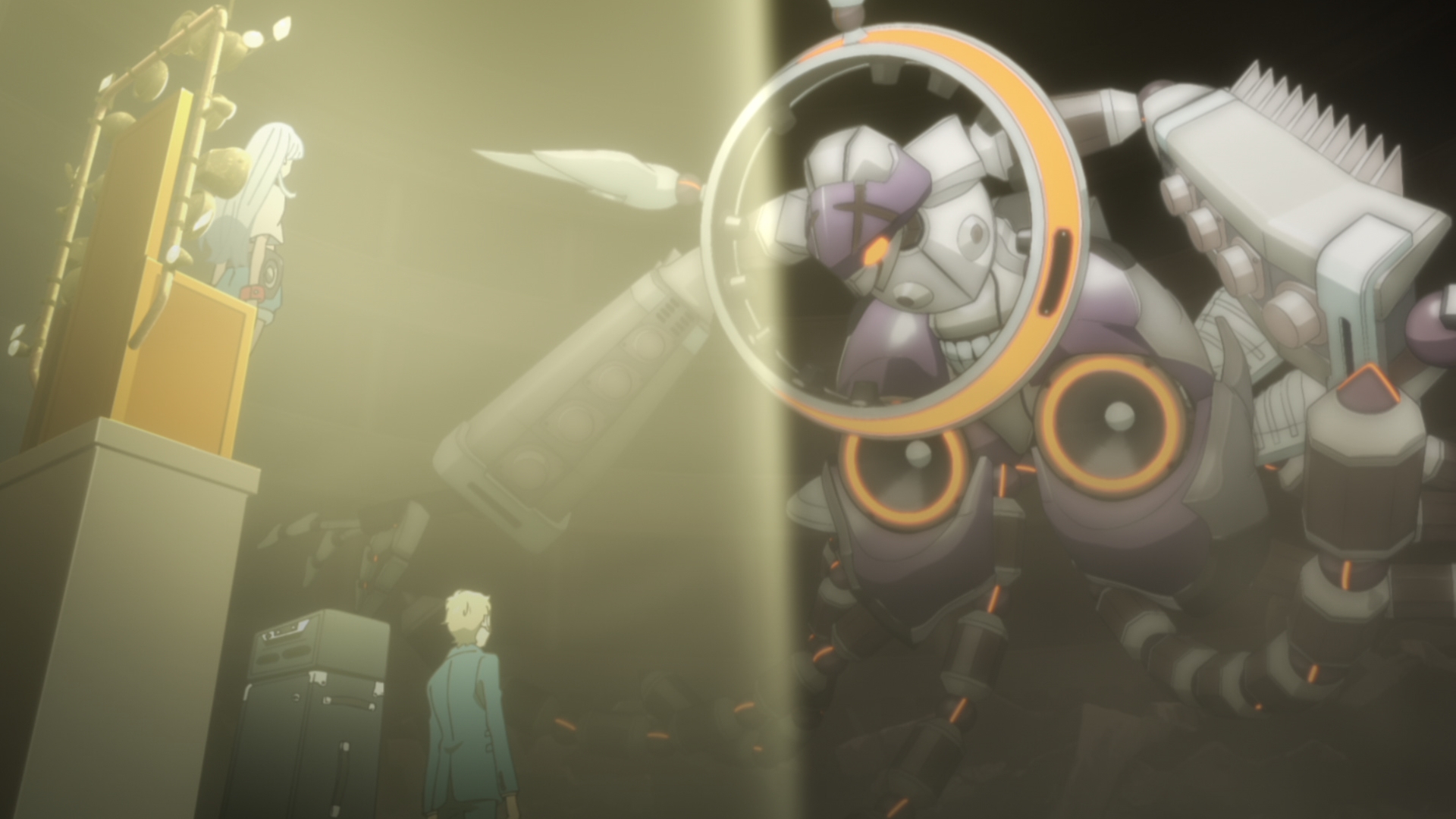ロンディニウムの街を眩い閃光で照らし出す異形のイクイップメント、デュエルショーマン。 その肩に乗るミュウの姿がかつてのジミの暴走と重なり、エコヲは衝撃を受ける。