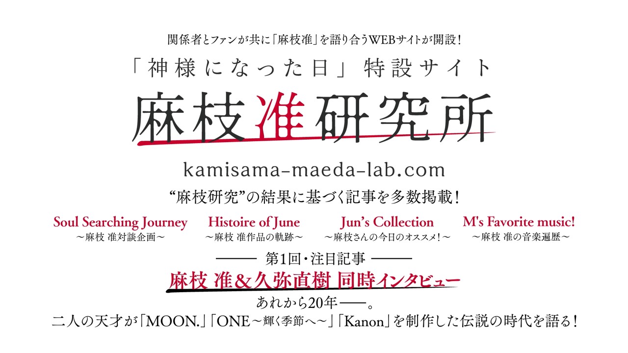 「神様になった日」の制作決定にあたり、製作スタッフとファンの皆様が「麻枝 准」について語り合うWEBサイト 『「神様になった日」特設サイト「麻枝准研究所」』を本日 5 月 10 日(日)より開設致しました!