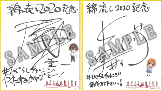 綿流し2020ひぐらしチャレンジを記念して竜騎士07先生、川口敬 一郎監督、保志総一朗さん(前原圭一 役)、中原麻衣さん(竜宮 レナ 役)の色紙プレゼントキャンペーン開催いたします! 各アカウントのフォロー&対象キャンペーンツイートをRTしていた だいた方の中から、抽選でサイン色紙をプレゼントいたします。