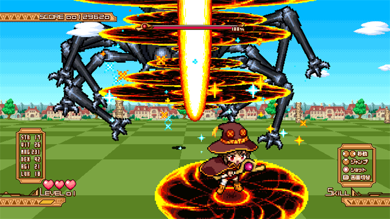 プレイヤーはカズマ、アクア、めぐみん、ダクネス、ゆんゆん、クリスを操作し、キャベツ、ゴブリン、機動要塞デストロイヤーなど、『このすば』お馴染みの敵を倒していきます。操作できるキャラクターは、福島潤・雨宮天らキャスト陣によるボイス付きで、かけ声や呪文と共に、疑似3D空間を縦横無尽に駆け回ります。