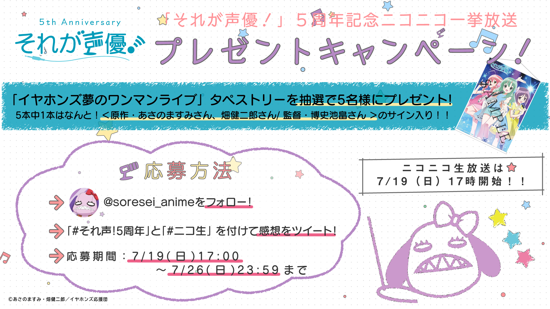 5周年を記念して、ニコニコ生放送にてTVアニメ『それが声優!』全13話の一挙放送が決定しました! 今回は5周年記念スペシャルとしまして原作・スタッフ・イヤホンズからのお祝いメッセージや監督の解説コメント付きとなっております。