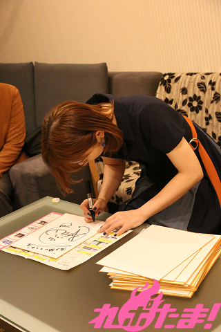 ホテルの一室でインタビューを受けたほか、景品用のサイン色紙やポスターにサインを書き込む作業を行ない、忙しい時間を過ごした杉山さん。