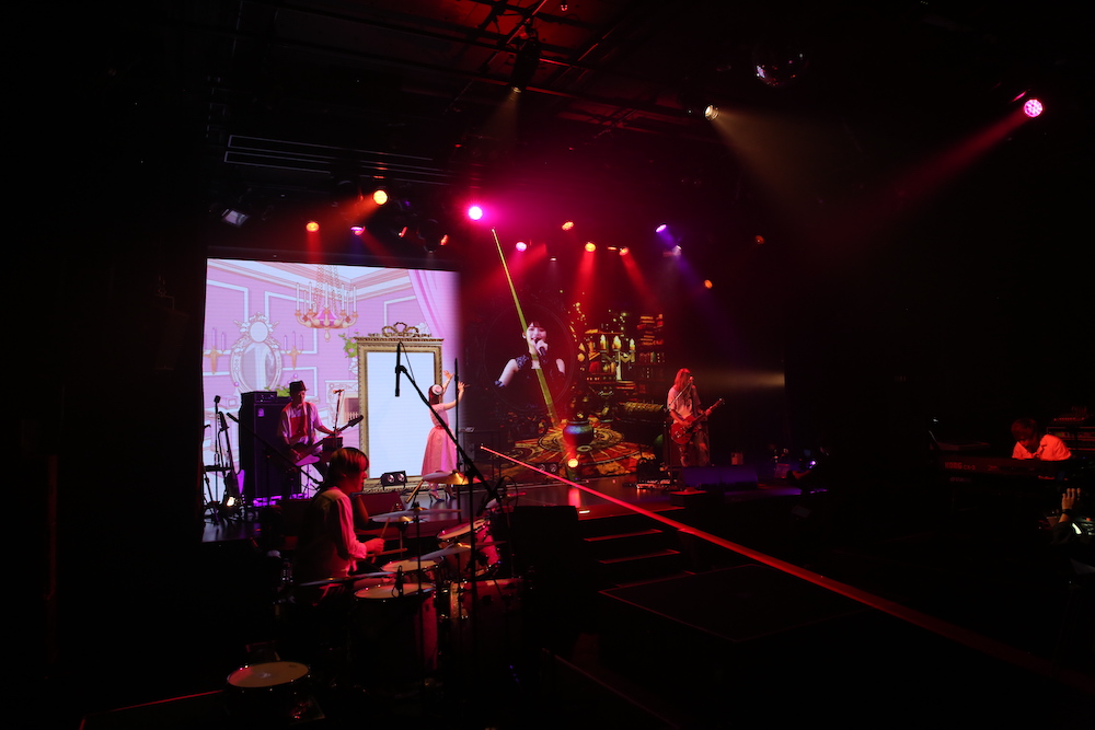 ピンクを基調とした衣装でステージに登場した内田。今回は配信ライブということで、通常のライブとは趣の異なる演出が多数加えられた。まず、バンドメンバーは、会場全体を活かし、ステージ上と本来客席となるスペースに分散配置。ソーシャルディスタンスを意識した、内田曰く「騎馬戦的な」スタイルが採用された。