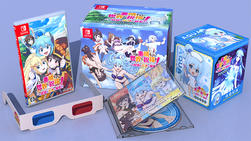 限定版特典のイメージ画像も公開しました。今回、デザイン画が初公開となった特別衣装SDフィギュアは、 Switch版がナース姿の「アクア」、PS4®版がチアガール姿の「めぐみん」で、今作に登場する服装をデフォル メしたものになっています。更に、Machicoが歌唱する主題歌ショートバージョンも収録したゲームオリジナル サウンドトラックCD、初回特典シューティングゲームを立体視モードで楽しむことができる赤青メガネも、限定 版パッケージイラストが使用された特製BOXに同梱されます。