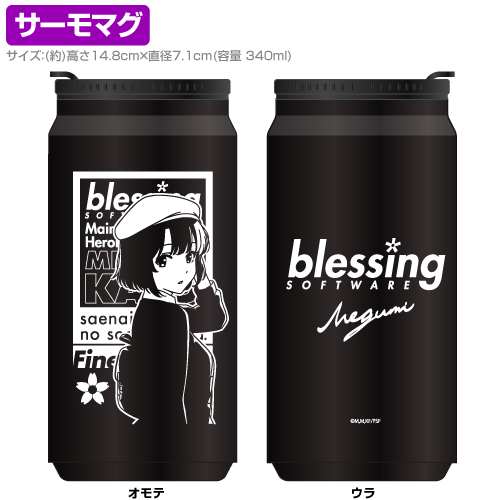 blessing softwareのロゴと、恵がプリントされたスタイリッシュなサーモマグ。
