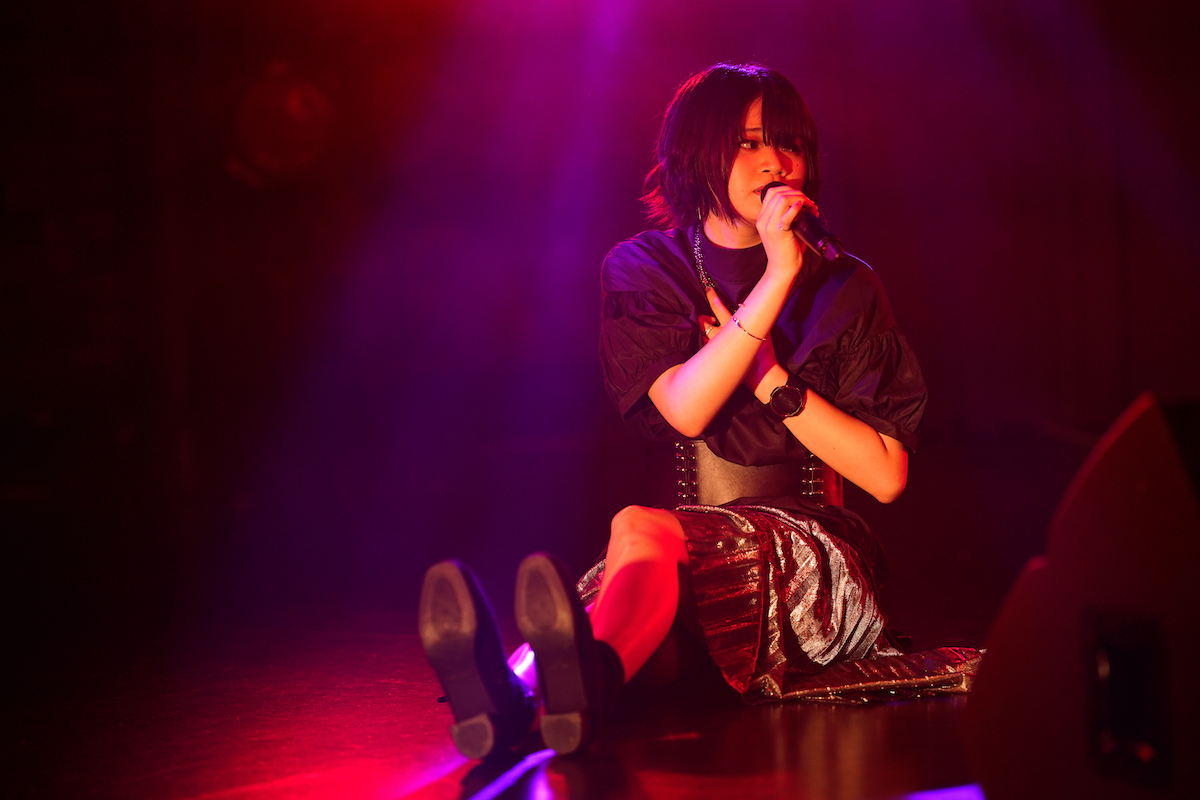 ここでガラリとライブの空気を変えたのは3曲目の「乱反射↘↑↗」。バグベアが手掛ける楽曲に、彼らとニノミヤ本人が共作した歌詞が映える珠玉チューン。音の粒子が瞬くようなエモーショナルな旋律に、陰キャで目立たない自分でも逆転劇へと気持ちを繋いでいくのだ、という想いが滲むナンバーだ。聴く者の背中をただ押すのではなく、一緒に踏み出そうというメッセージを感じさせる。そんな「乱反射↘↑↗」を歌い切ると、ステージから姿を消すニノミヤ。無人のステージ中央にスポットライトが当たると、ニノミヤの声だけが流れ出す。それはポエトリーリーディングによるMCだった。
