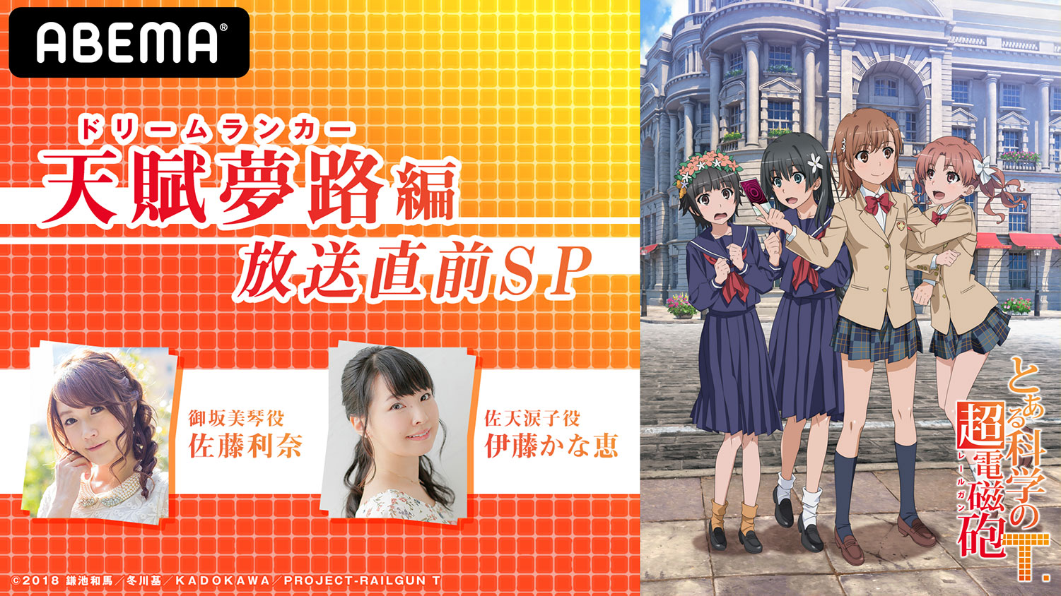 7 月24 日(金・祝)24 時 30 分よりABEMAアニメチャンネルにて、佐藤利奈さんと伊藤かな恵さんが出演の 特別番組『「とある科学の超電磁砲 T」天賦夢路(ドリームランカー)編 放送直前 SP』を放送! 新たに開幕する天賦夢路(ドリームランカー)編の見どころをたっぷりとご紹介します。
