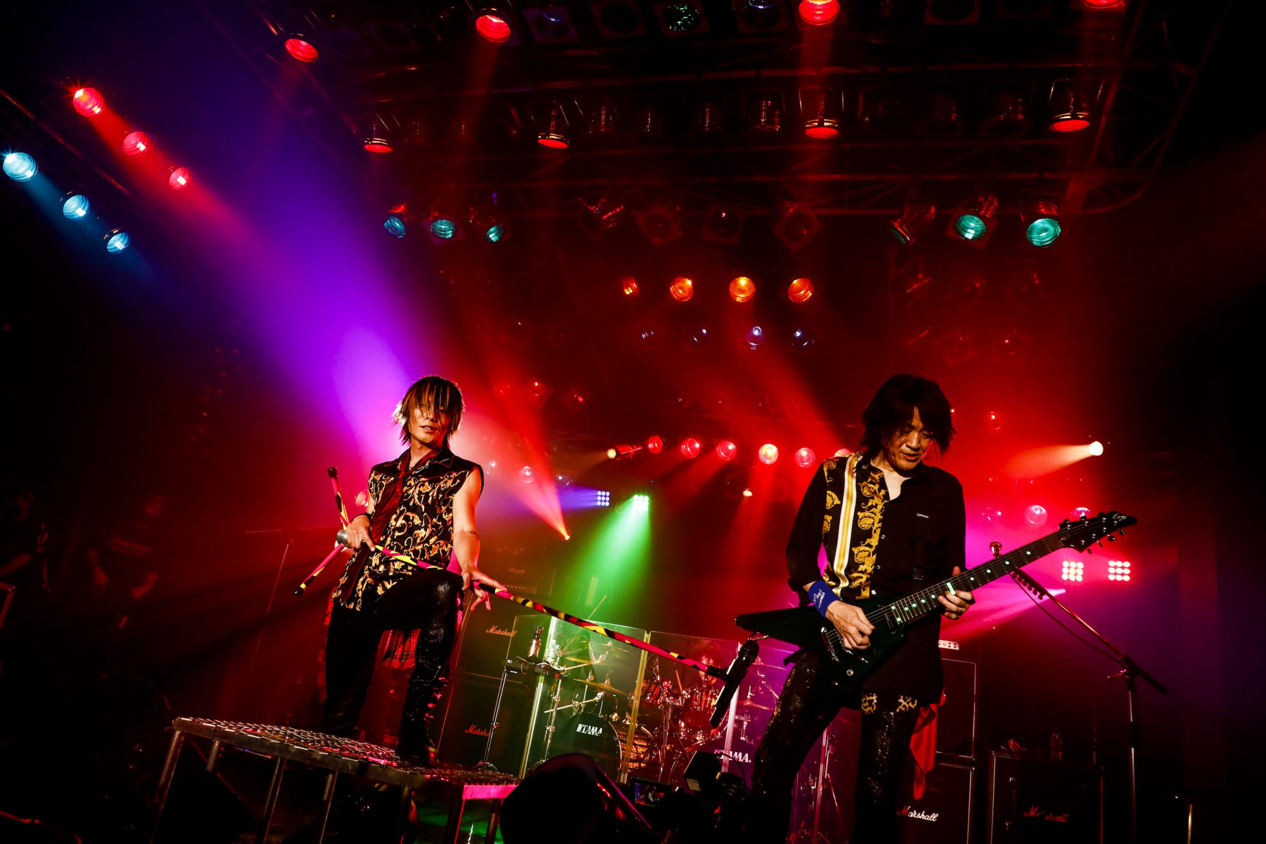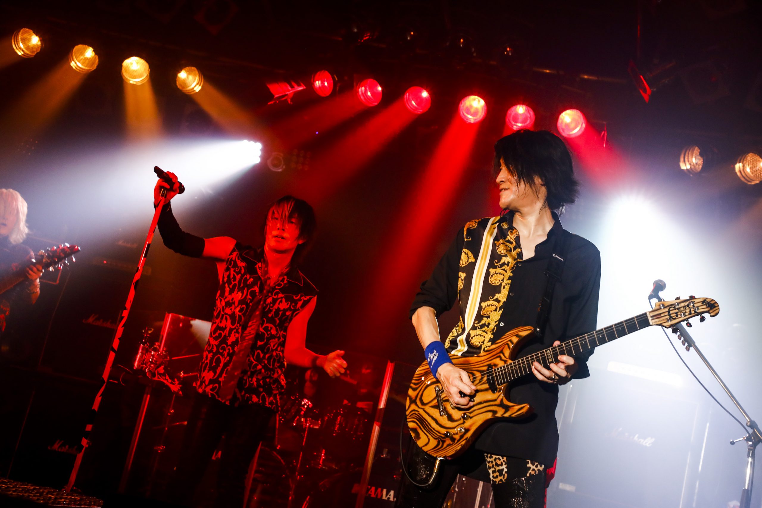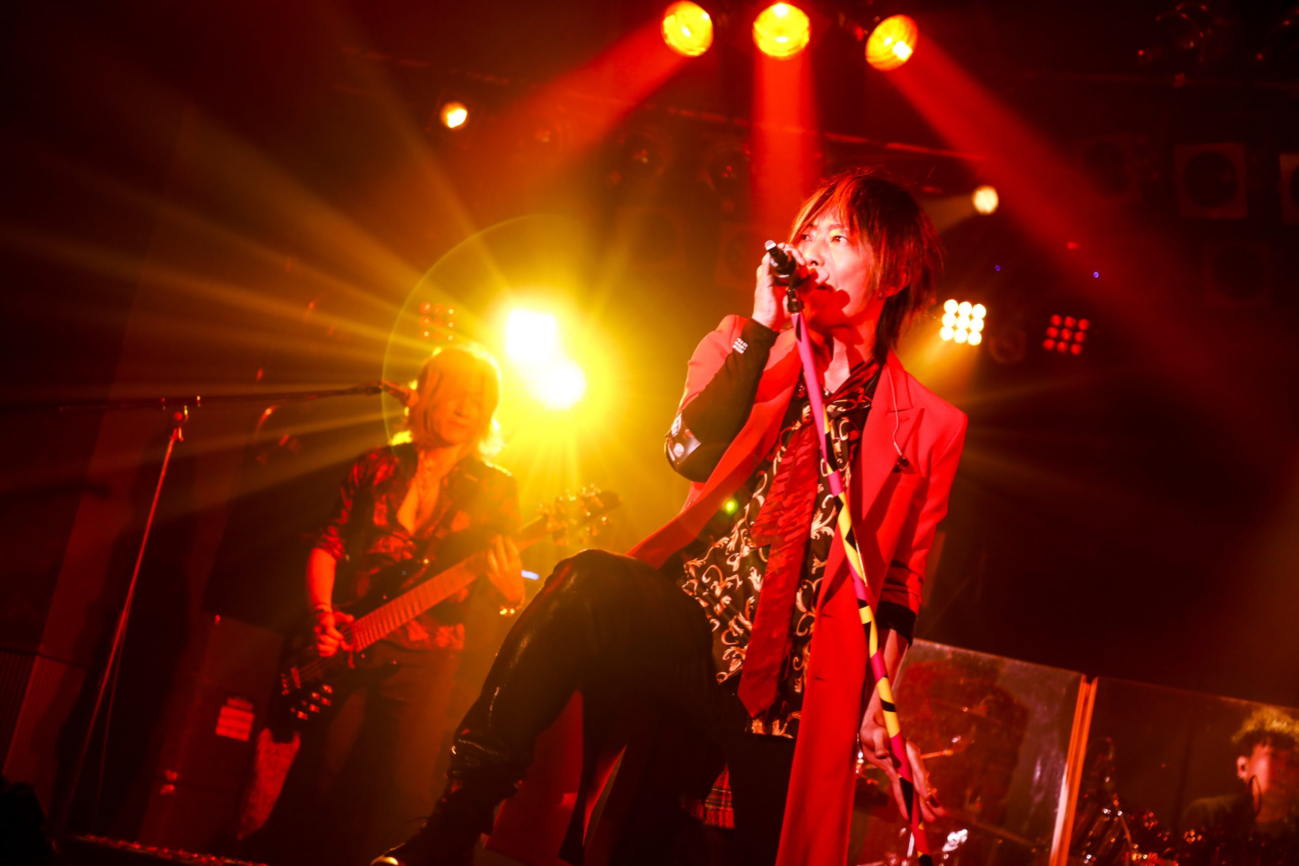 そして開演の19時半。暗転したステージに、映画のオープニングを思わせるような壮大なBGMが流れ出す。赤い照明が満ち、KISHOW、e-ZUKA(Gt.)とサポートメンバーの瀧田イサム(Ba.)、SHiN(Dr.)が登場。シルエットとなって、いつものポジションにスタンバイする。高まる興奮のなかで始まった1曲目は、9月9日にCDリリースとなる最新シングル「情熱は覚えている」だ。シタールのエスニックで幻想的なイントロから、静かに熱情を煽り、爆発させる。タフで鋭いKISHOWのボーカルと、e-ZUKAが跳ねながらうねりをもたらす力強いグルーヴは、まさにGRANRODEOの最新進化形だ。