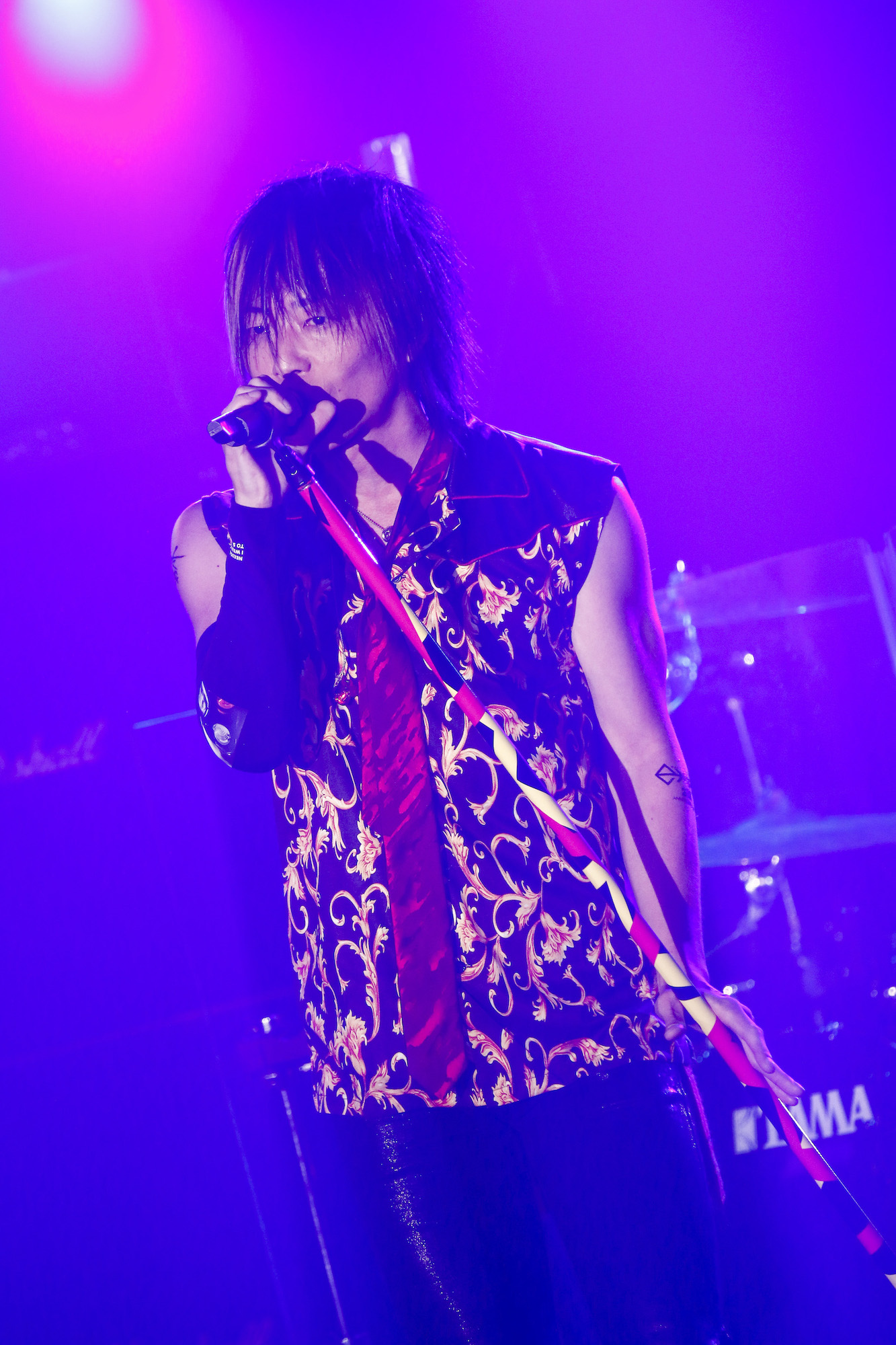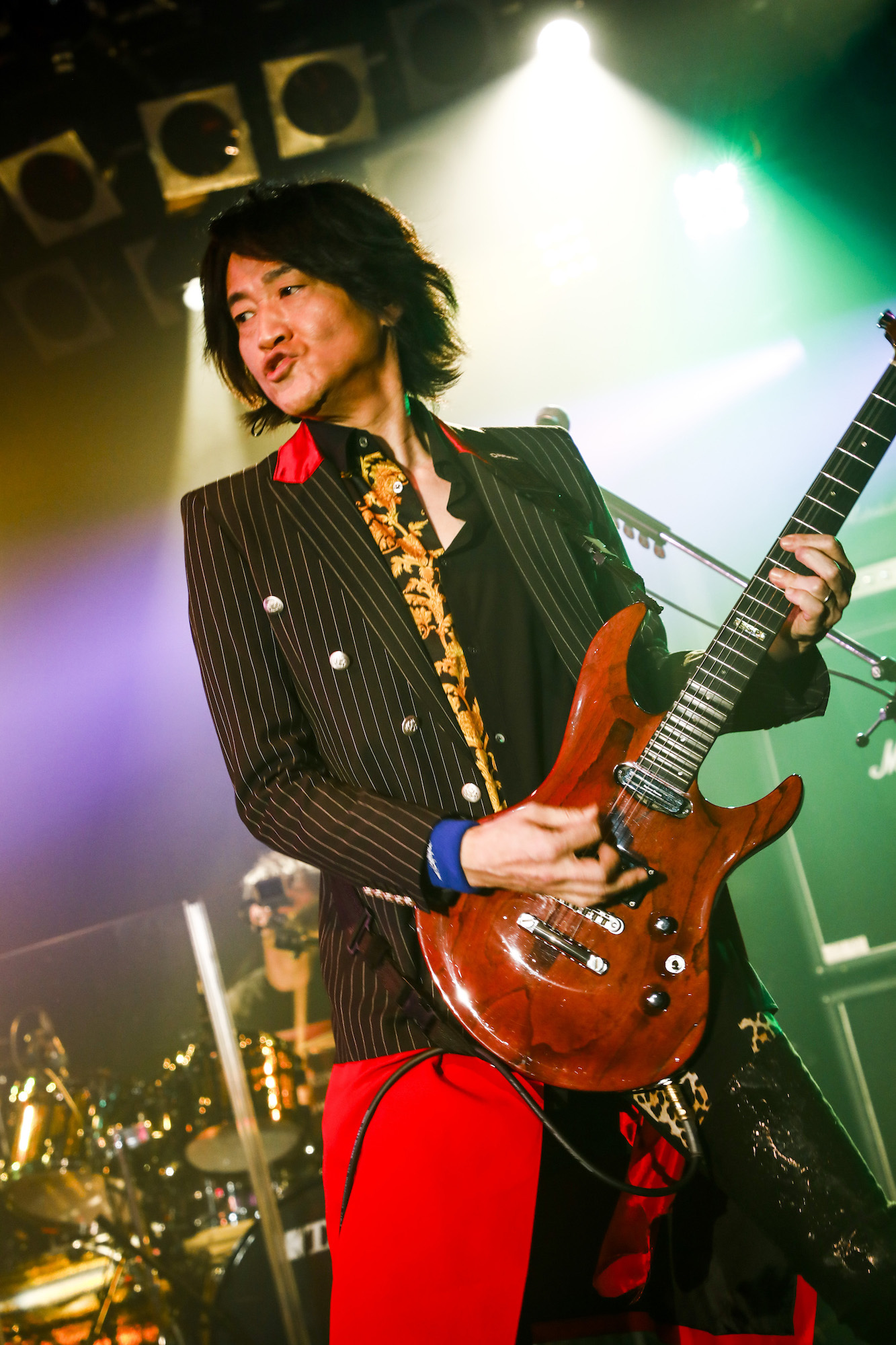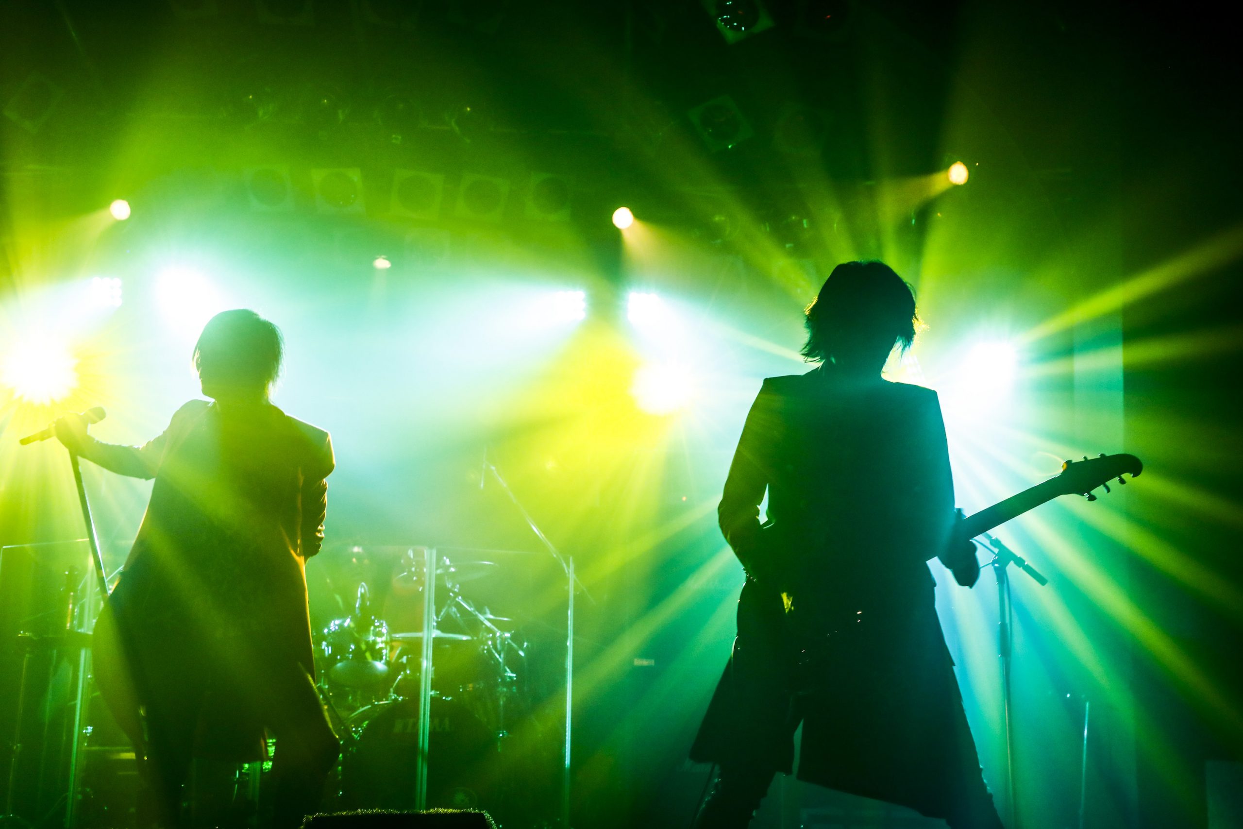 そして開演の19時半。暗転したステージに、映画のオープニングを思わせるような壮大なBGMが流れ出す。赤い照明が満ち、KISHOW、e-ZUKA(Gt.)とサポートメンバーの瀧田イサム(Ba.)、SHiN(Dr.)が登場。シルエットとなって、いつものポジションにスタンバイする。高まる興奮のなかで始まった1曲目は、9月9日にCDリリースとなる最新シングル「情熱は覚えている」だ。シタールのエスニックで幻想的なイントロから、静かに熱情を煽り、爆発させる。タフで鋭いKISHOWのボーカルと、e-ZUKAが跳ねながらうねりをもたらす力強いグルーヴは、まさにGRANRODEOの最新進化形だ。