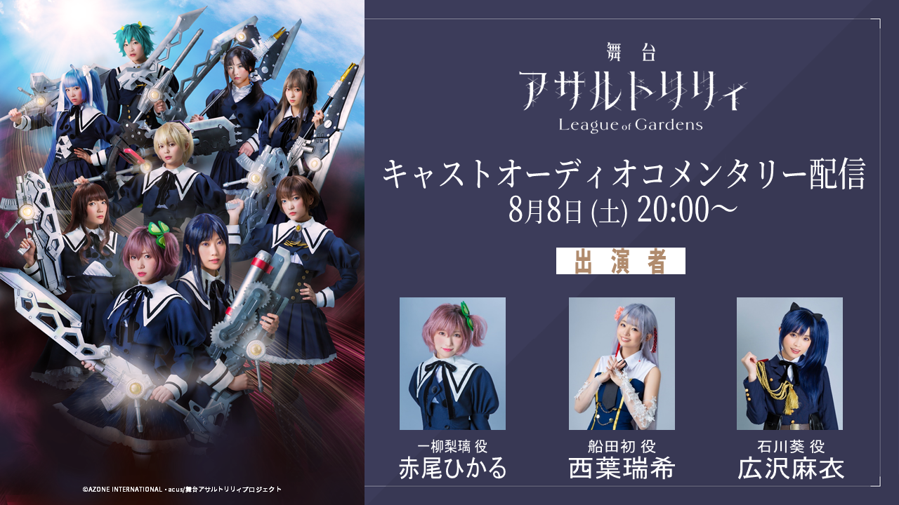 8月8日(土) 20:00より、1月に開催し大盛況の内に幕を下ろした、舞台「アサルトリリィ League of Gardens」キャストコメンタリー配信の第2弾を開催します。
