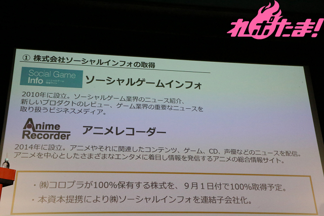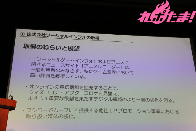 ここで(株)ソーシャルインフォの根本雄貴社長が登壇。根本氏は入社5年目と若く、5年以内での社長就任はブシロードでは初とのこと。「媒体を通じて、ゲーム・アニメ業界を盛り上げていく所存です」と所信表明を行なった。