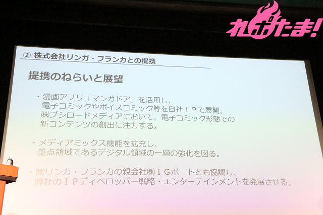 同社は出版社横断のマンガアプリを運営しており、市場全体を見ると、電子書籍の売り上げが伸びていることを鑑みて、漫画アプリ「マンガドア」を「電子書店」に見立て、電子コミックやボイスコミック等の形態でのオリジナルのコンテンツを伸ばしていく狙いがあるとのことだ。