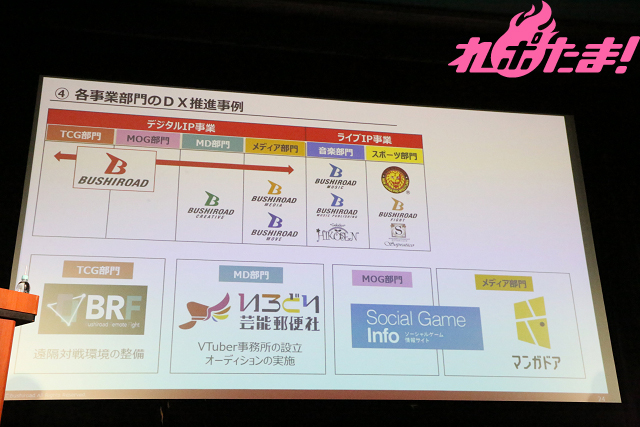 ブシロードの事業は大きく分けて「TCG部門」「MD部門」「MOG部門」「メディア部門」、そして「音楽部門」「スポーツ部門」の6つに分かれており、ここでは特に前半4部門においてのデジタル化について説明。