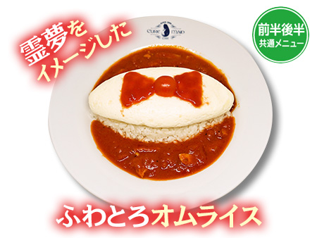 博麗霊夢をイメージした「霊夢のリボンオムライス」は、巫女服の色合い赤と白をベースにした、トマトソースと白オムレツに! 霊夢のトレードマークである大きなリボンを絶品トマトソースで表現しました。