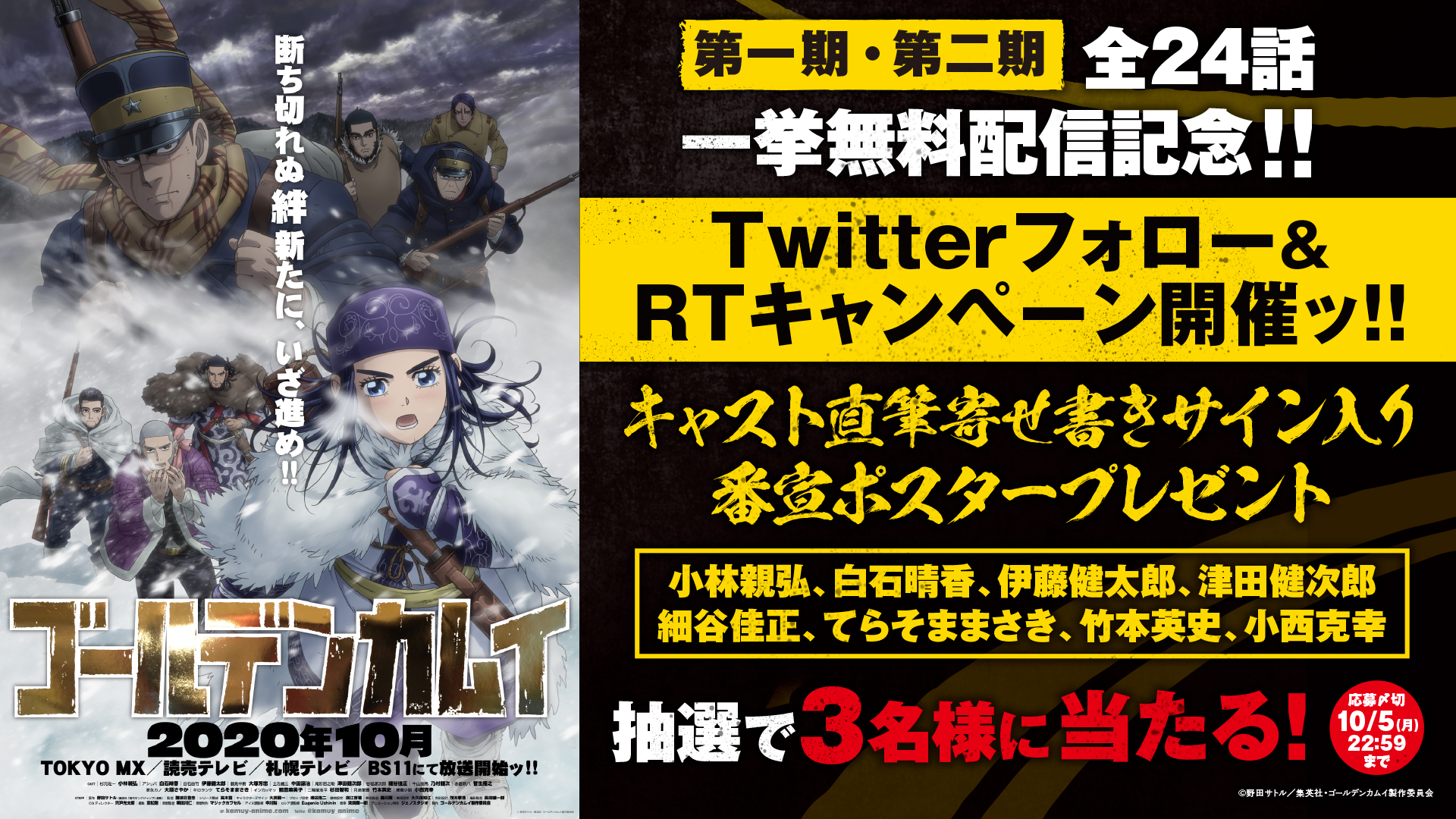 TVアニメ『ゴールデンカムイ』公式Twitterアカウント(@kamuy_anime)をフォロー後、アニメ公式Twitterから9月29日(火)18時頃に投稿された応募ツイートをRTしていただいた方の中から抽選でキャスト直筆サイン入りポスターをプレゼントいたします。