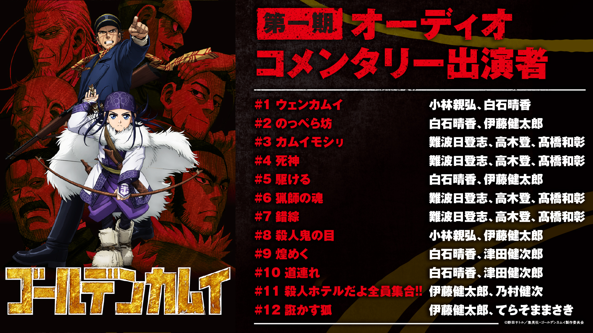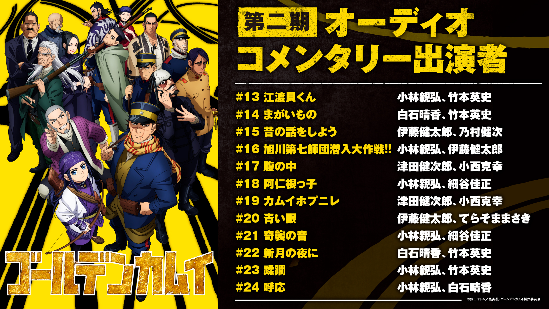 小林親弘(杉元佐一役)、白石晴香(アシ(リ)パ役)、伊藤健太郎(白石由竹役)、津田健次郎(尾形百之助役)、細谷佳正(谷垣源次郎役)、乃村健次(牛山辰馬役)、てらそままさき(キロランケ役)、竹本英史(月島軍曹役)、小西克幸(鯉登少尉役)、難波日登志(監督)、高木登(シリーズ構成)、髙橋和彰(プロデューサー)