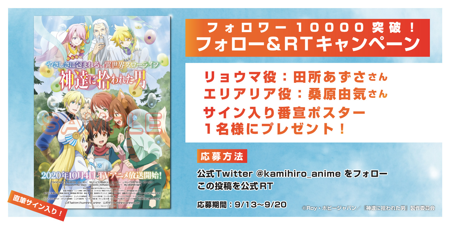 TVアニメ『神達に拾われた男』公式Twitterアカウントのフォロワー10,000突破を記念して、田所あずさ&桑原由気サイン入りの番宣ポスターを1名様にプレゼントいたします。