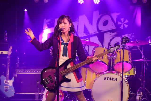 萩原七々瀬役 東城日沙子(以下:東城):率直に、終わっちゃって寂しいと思いました。練習は1ヶ月前くらいから始めて、HaNaMiNaのことを考えながらベースをガシガシ練習していたので、収録ライブ後は一度燃え尽きた感じもありました。でも今日の定例会では、生放送という形でメンバーが集まって、ライブを見ながら、ライブで味わった空気をファンのみんなと一緒に味わうことができたので、楽しかったです。
