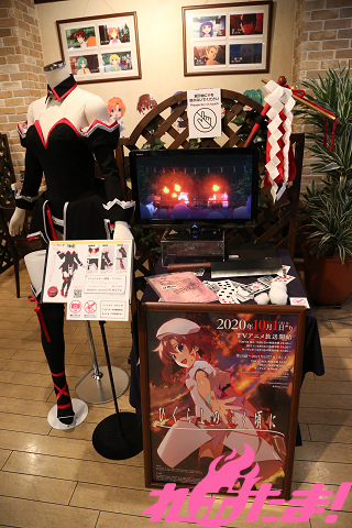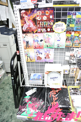 店内にはキャラクターたちや印象的なシーンの場面カット、開発中の公式コスチューム「エンジェルモート 制服 アニメver.」などの展示、先行販売「竜宮レナ Tシャツ 」といったグッズがずらり。